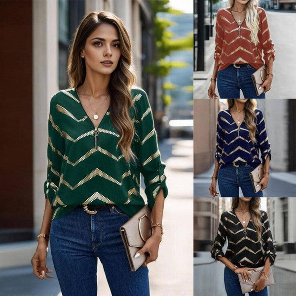 Camisa casual de rayas de manga larga y cuello en V para mujer