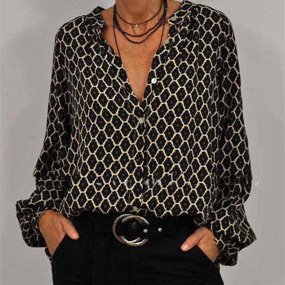 Primavera de las mujeres con cuello en V de manga larga de impresión de moda camiseta de la camisa