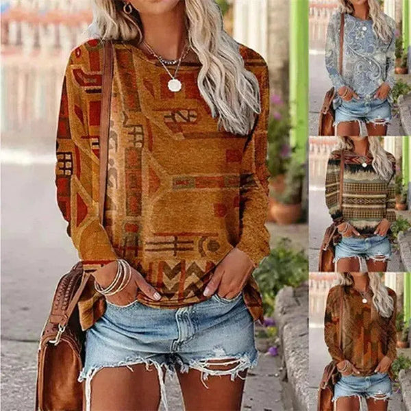 Camiseta estampada de manga larga y cuello redondo para mujer