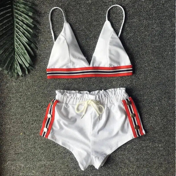 - Diseño: Conjunto de bikini de tres piezas que presenta un estilo de bañador partido