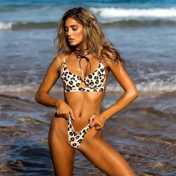 - Corte: Bikini de dos piezas, que cuenta con una parte superior y una parte inferior de triángulo clásico