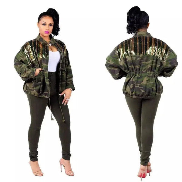 Chaqueta bomber de lentejuelas y camuflaje para mujer