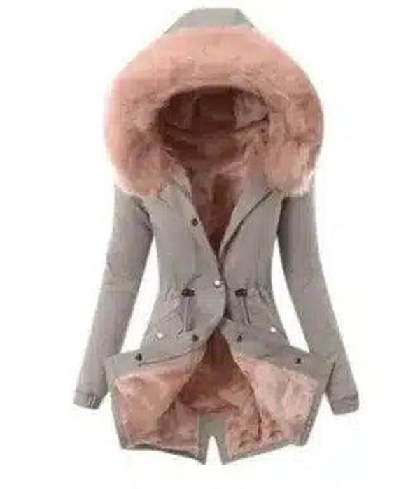 - Estilo de cuello/hombros: Diseño con capucha y ribete de piel sintética