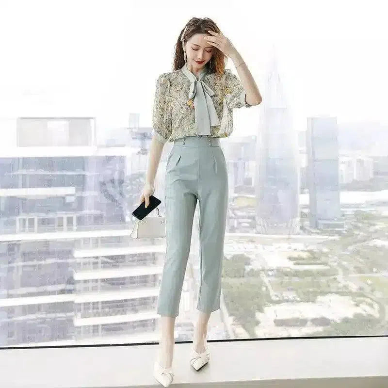 Elegante blusa con cuello de corbata y pantalón corto para mujer