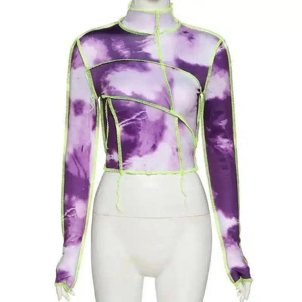 - Diseño: Llamativo estampado tie-dye en morado con ribete en contraste