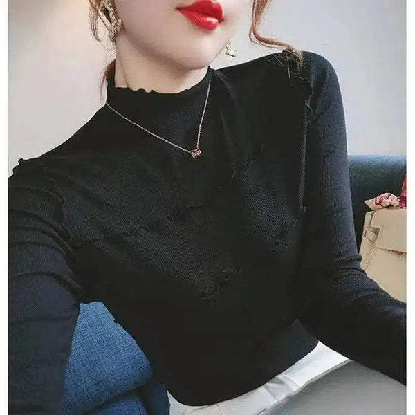 - Cuello: Cuello en forma de maillot con borde festoneado