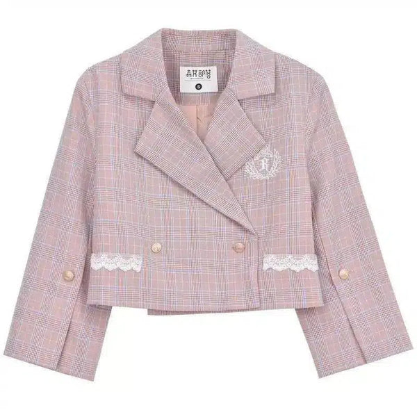 - Detalles de diseño: Cierre de doble botonadura, detalles de encaje en los bolsillos, estampado de cuadros