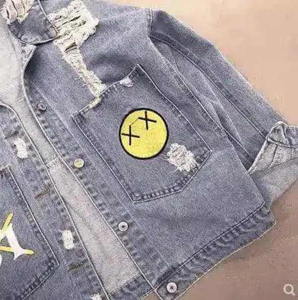 - Características de diseño: Parches gráficos atrevidos y detalles deshilachados