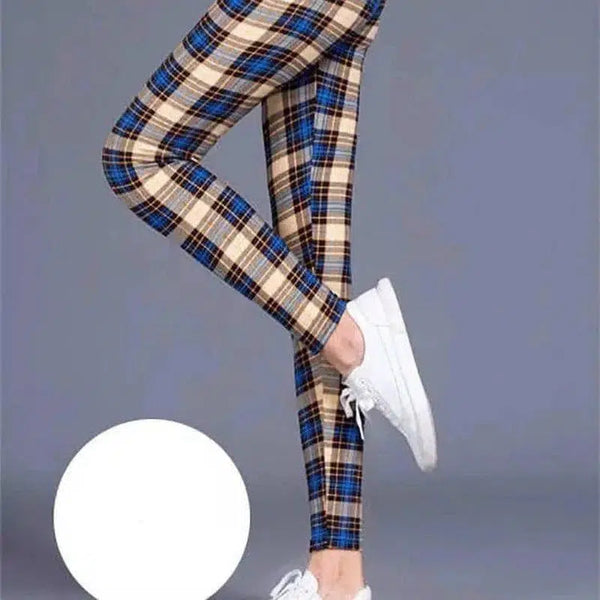 - Estampado clásico de cuadros escoceses en beige, azul y negro.