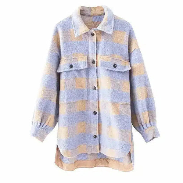 - Chic Checkered Pattern: destaca con estilo con el llamativo diseño de cuadros azules y beige de la chaqueta, un estampado atemporal que añade un toque de encanto clásico a cualquier atuendo.
