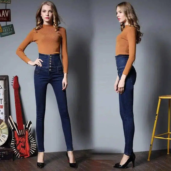 pantalones vaqueros de cintura alta mujer delgada elástica pies pantalones lápiz