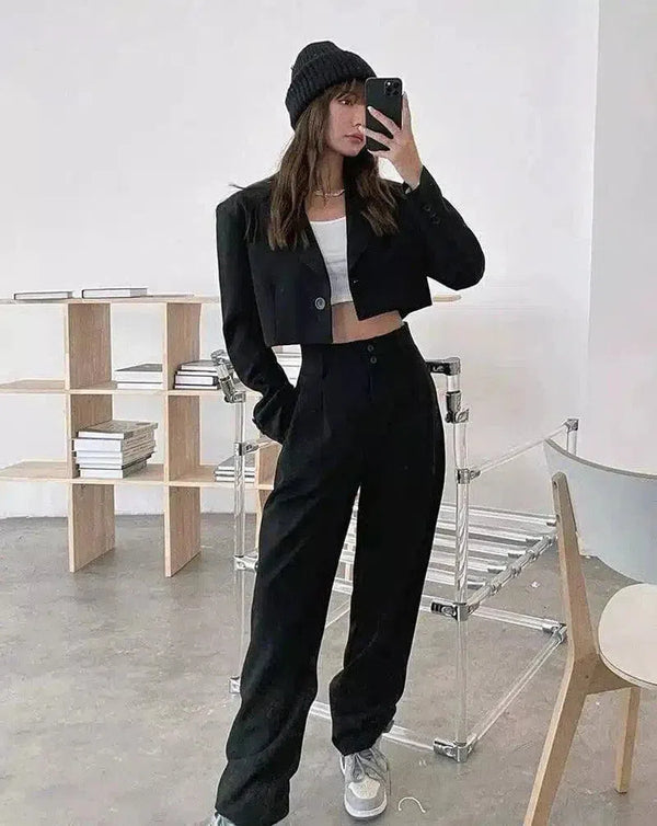 - Tipo de prenda: Conjunto de dos piezas compuesto por blazer cropped y pantalón de cintura alta