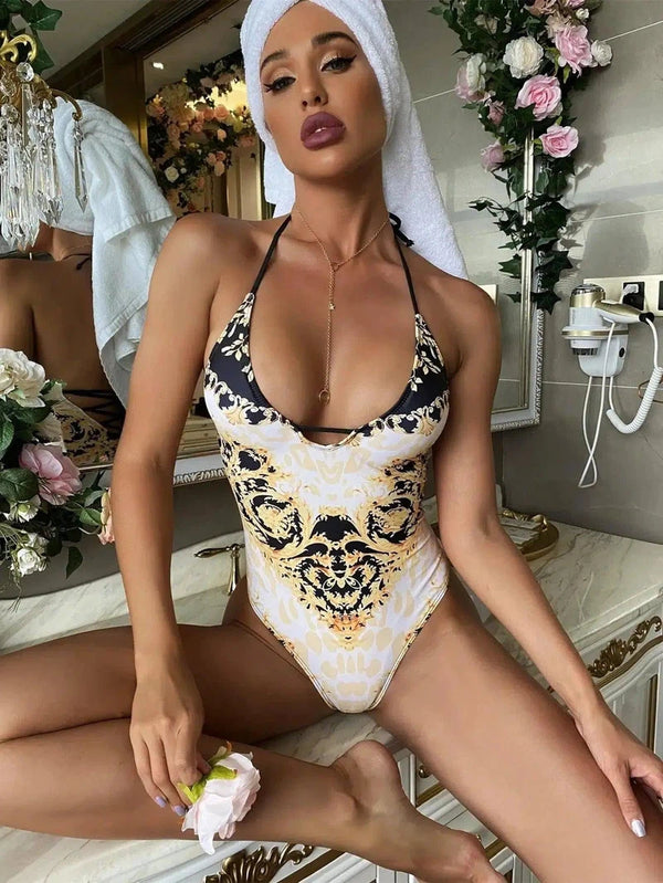- Estilo: Bañador de una pieza con estampado retro y silueta de bikini .