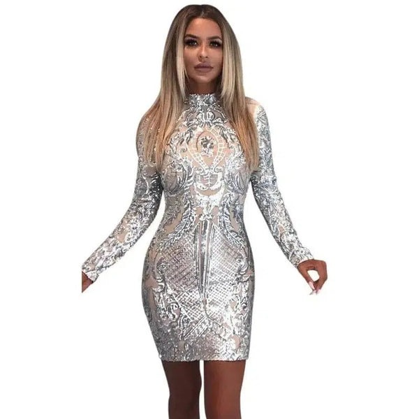 Cuello Alto Manga Larga Lentejuelas Elegante Vestido de Fiesta