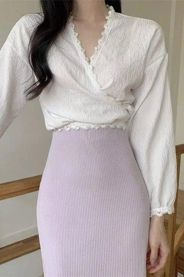 Blusa de encaje con cuello en V y falda lápiz de punto