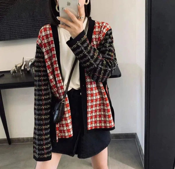 - Diseño de patrón intrincado: la americana presenta un patrón clásico de pata de gallo en rojo y negro, entremezclado con sutiles hilos metálicos para un toque de brillo y glamour.
