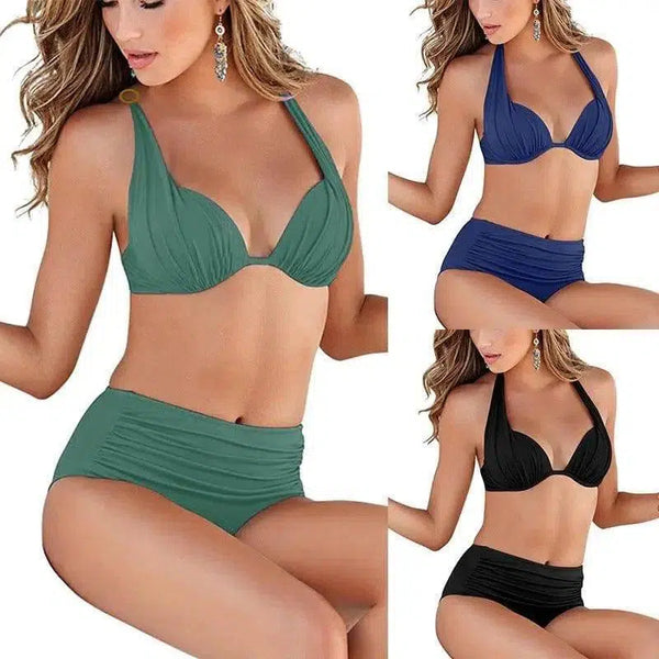 Descripción del producto: Bikini con aros y volantes Traje de baño liso de tiro alto