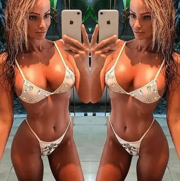 - Diseño: Elegante y glamuroso conjunto de bikini adornado con lujosos detalles de bling y diamantes.