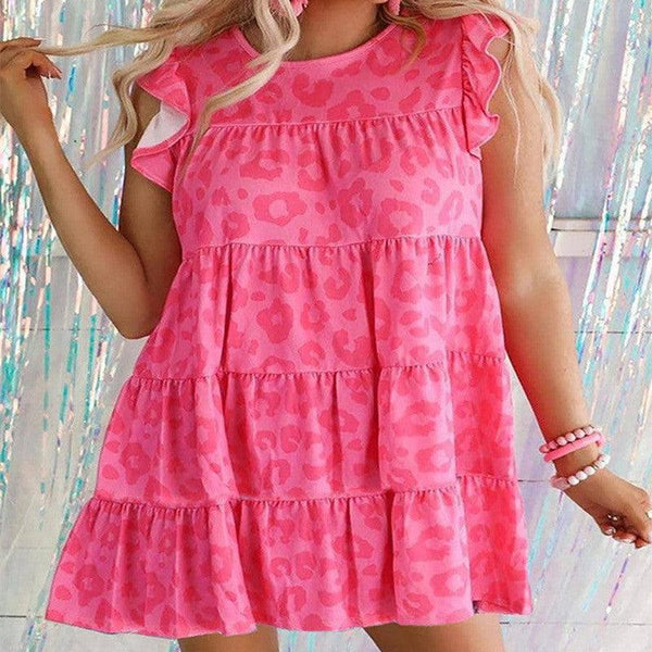 Mini Vestido de Verano con Capas y Cuello Redondo con Volantes y Estampado de Leopardo