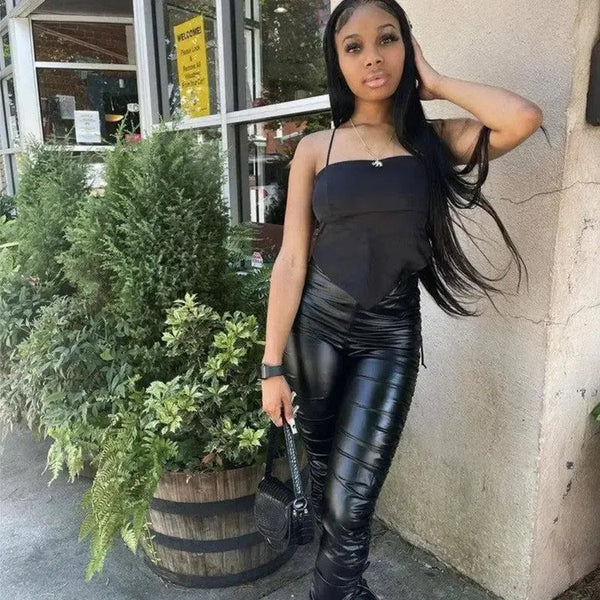 Pantalones ajustados de cuero elástico con pliegues y cintura alta
