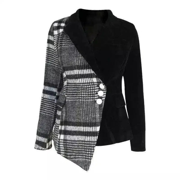 - Detalles de diseño: A cuadros en contraste y paneles sólidos, doble botonadura con botones decorativos .
