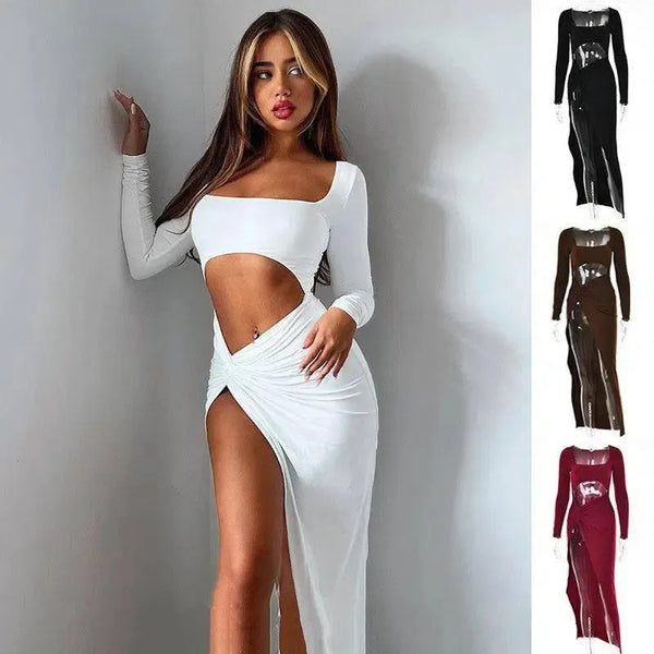 Ropa de Mujer Vestido de Manga Larga Moda Hueco Cuello en U Vestido Dividido Fiesta Boda